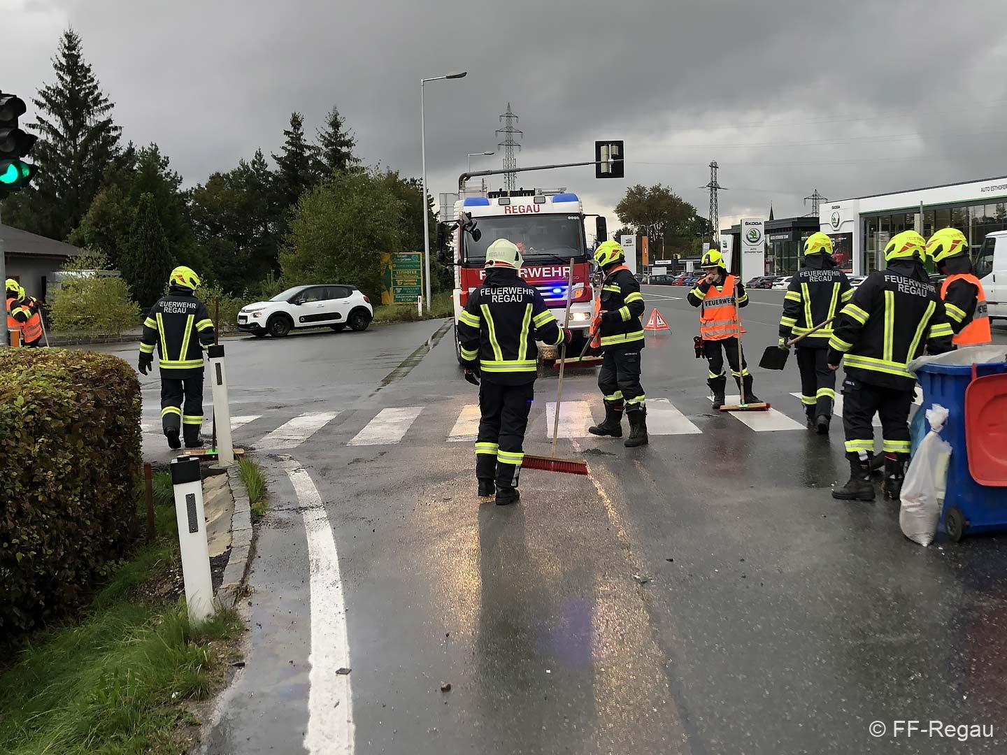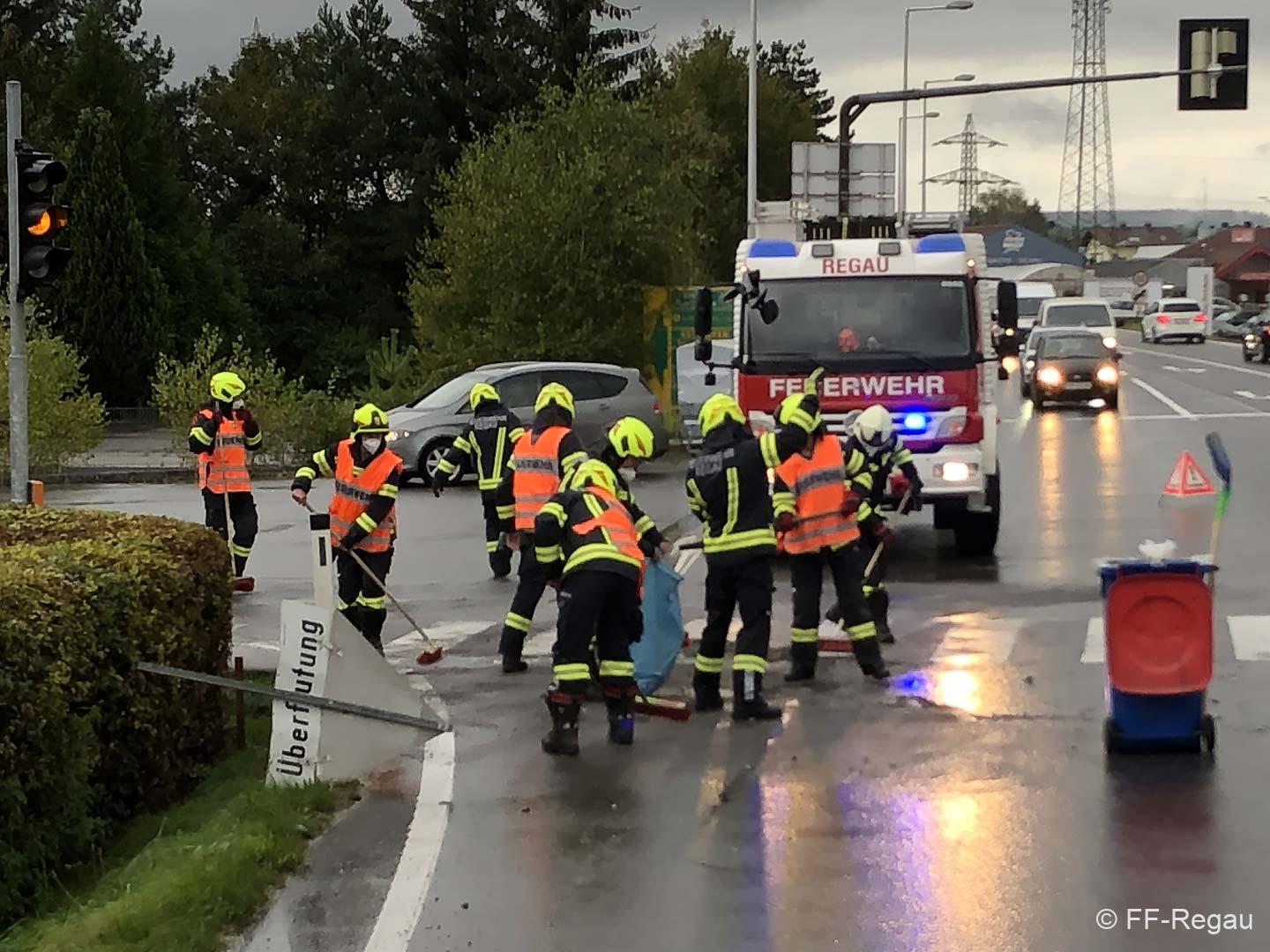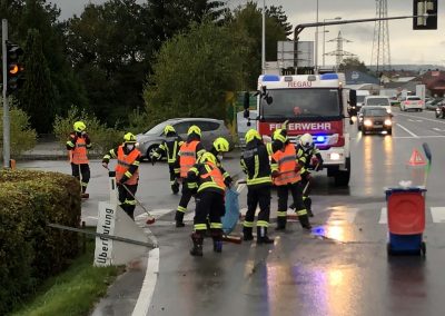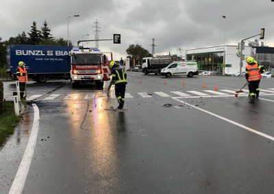 Unsere Aufgabe bestand auch dieses Mal darin, die Unfallstelle von herumliegenden Teilen zu reinigen und ausgeflossene Flüssigkeiten mit Bindemittel zu binden und zu entfernen. Während dieser Arbeiten wurde der Verkehr lokal umgeleitet.