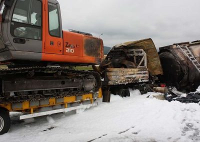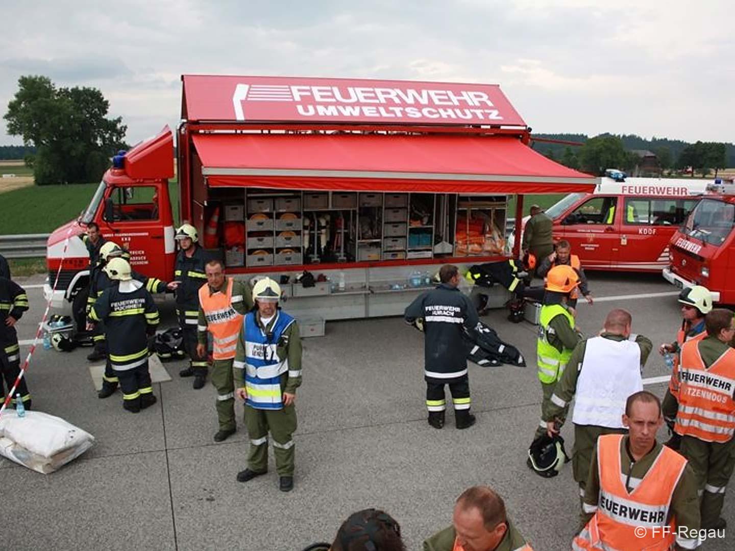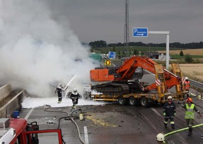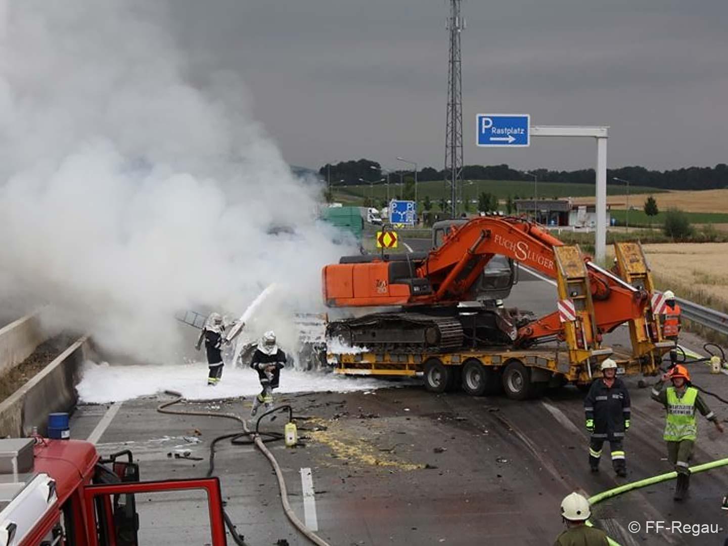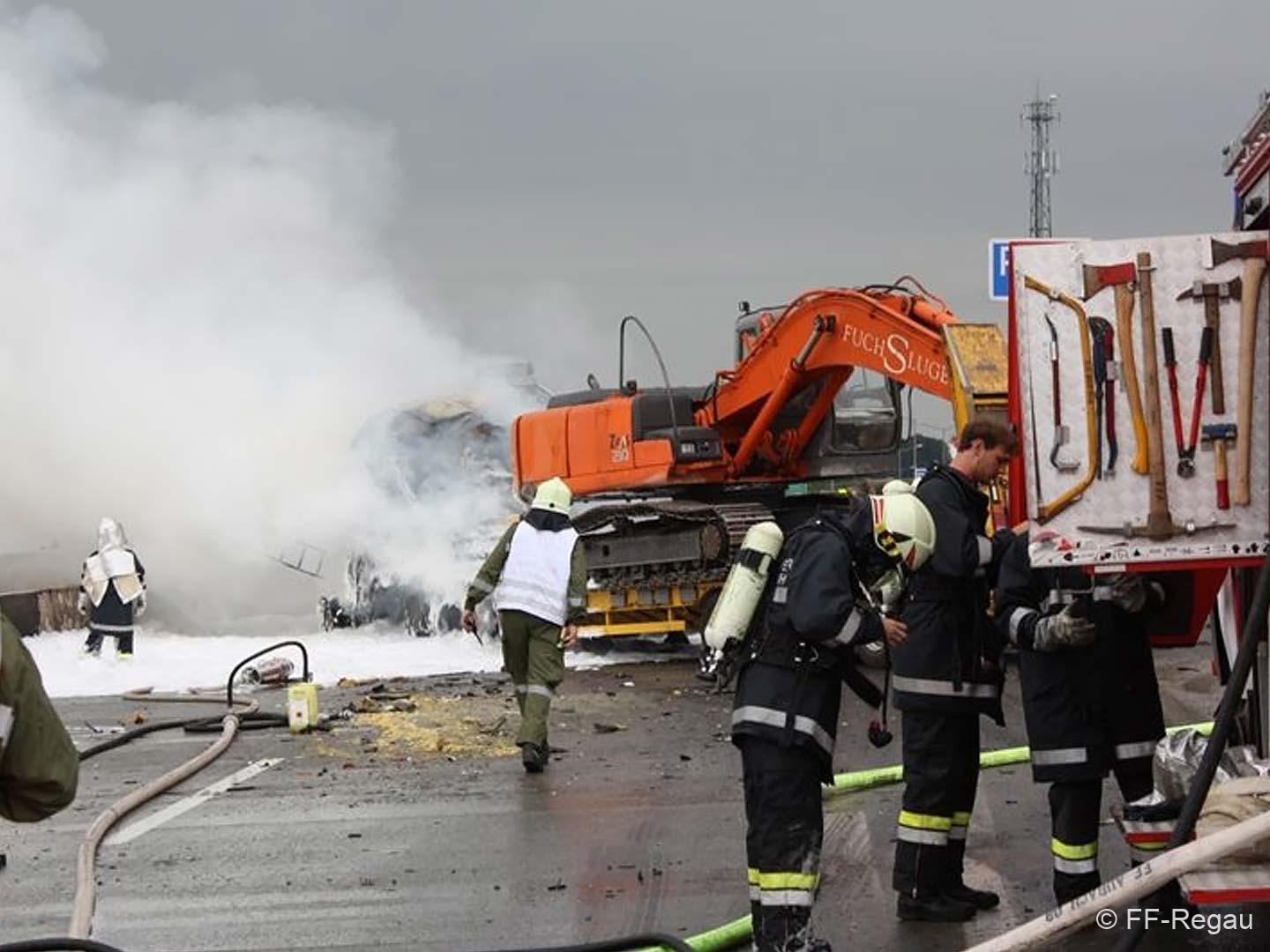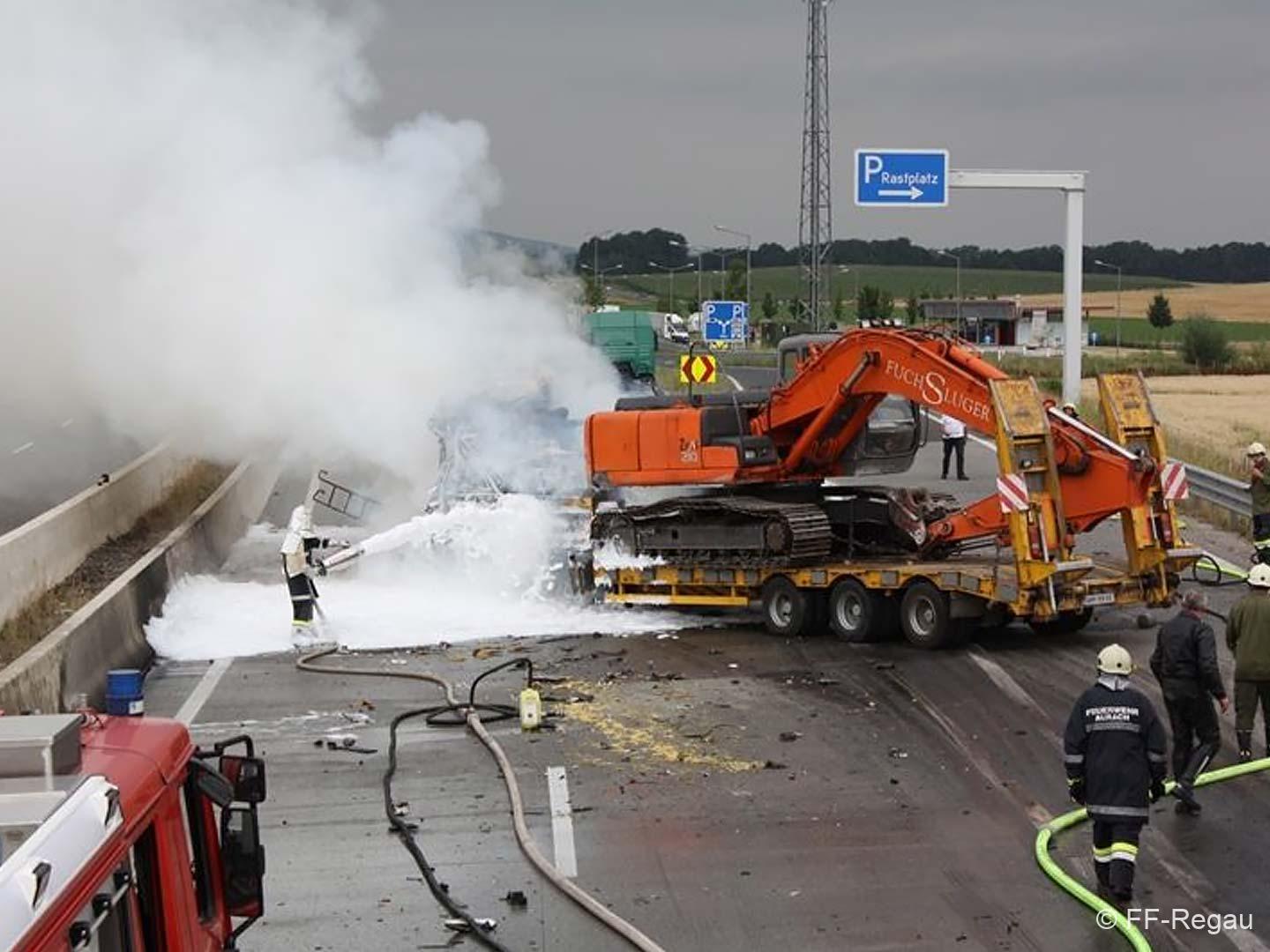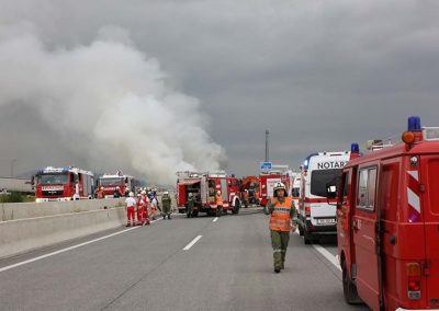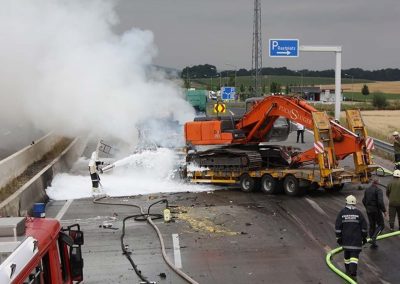 Während der Anfahrt zum Einsatzort informierte uns die Landeswarnzentrale über einen LKW-Unfall mit einem in Brand stehenden Fahrzeug: genau bei der Einfahrt zum Rastplatz Hainbach war ein mit einem Bagger beladener Tieflader einem Gefahrguttransporter frontal von hinten aufgefahren. Der Tieflader ging darauf gleich in Flammen auf und für dessen Lenker kam leider jede Hilfe zu spät.