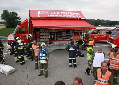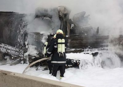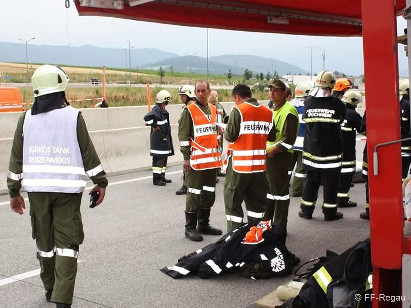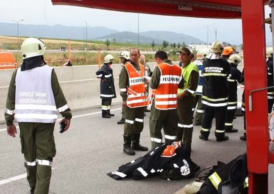 Mit unserem Tanklöschfahrzeug speisten wir das TLFA der FF Rutzenmoos. Unsere Atemschutzträger waren mit den Atemschutztrupps mit dem Kühlen des Tankzuges beschäftigt. Die Mannschaft des KDOF’s richtete währenddessen die Einsatzleitstelle ein.