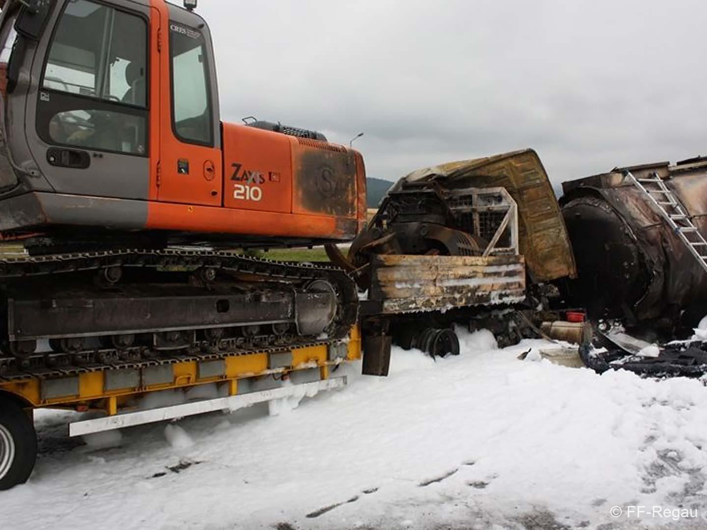 Der Fahrer des Gefahrgutfahrzeuges, welches Maleinsäureanhydrid geladen hatte, konnte seine Zugmaschine noch selbständig abkoppeln.