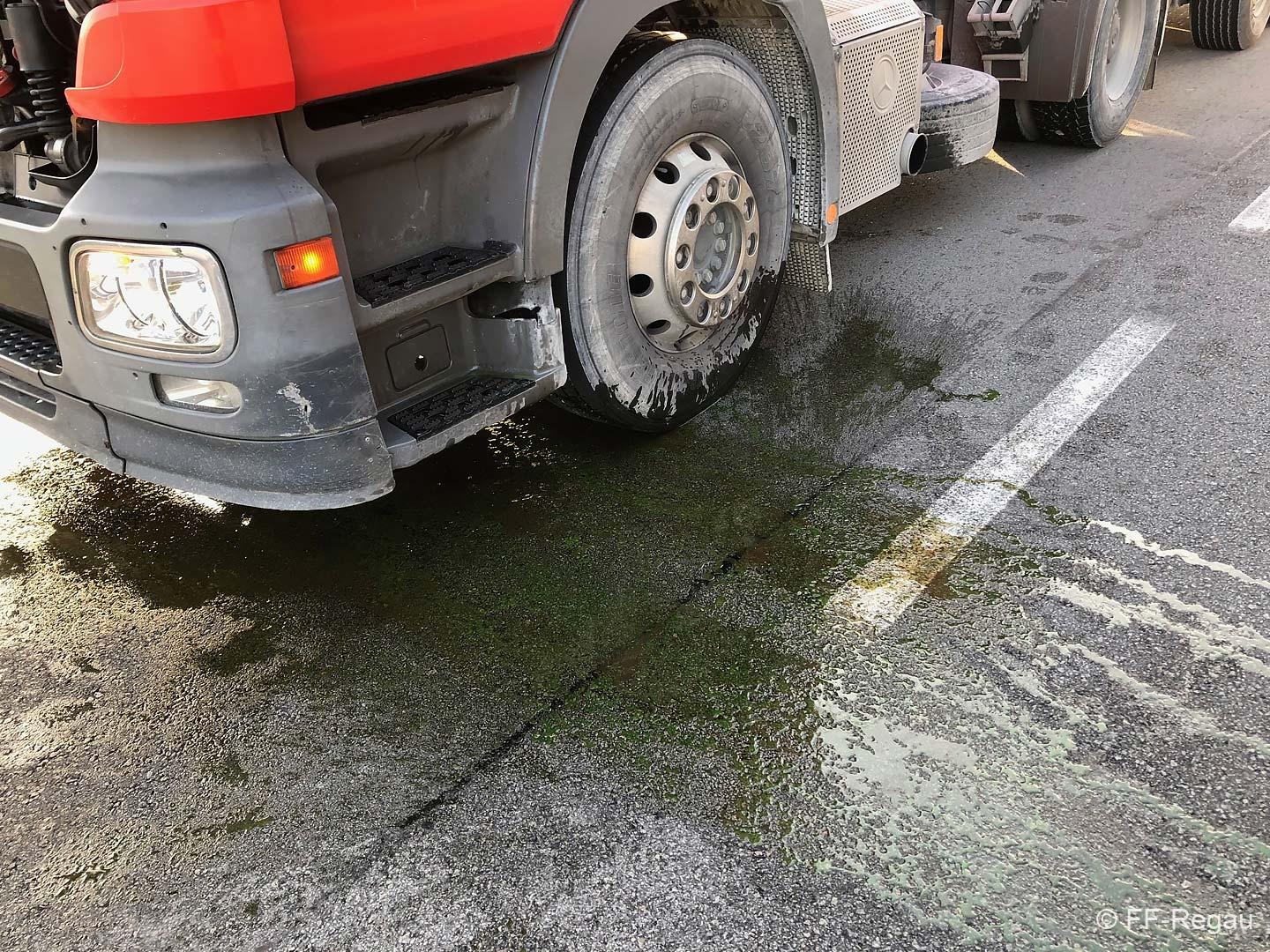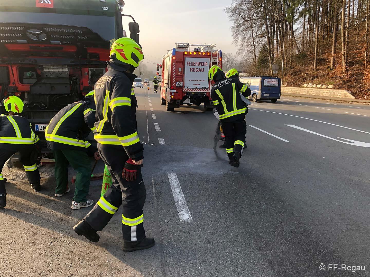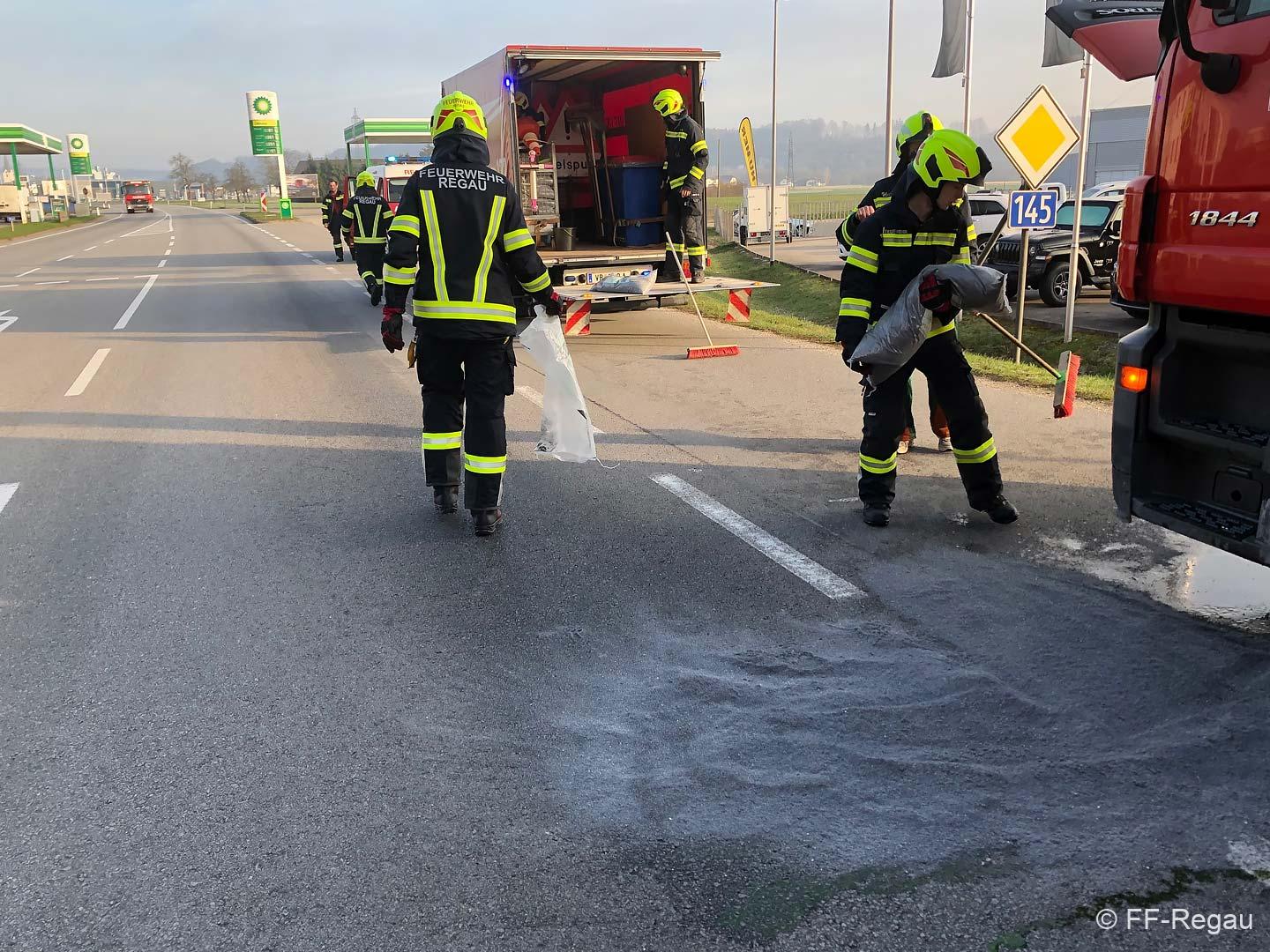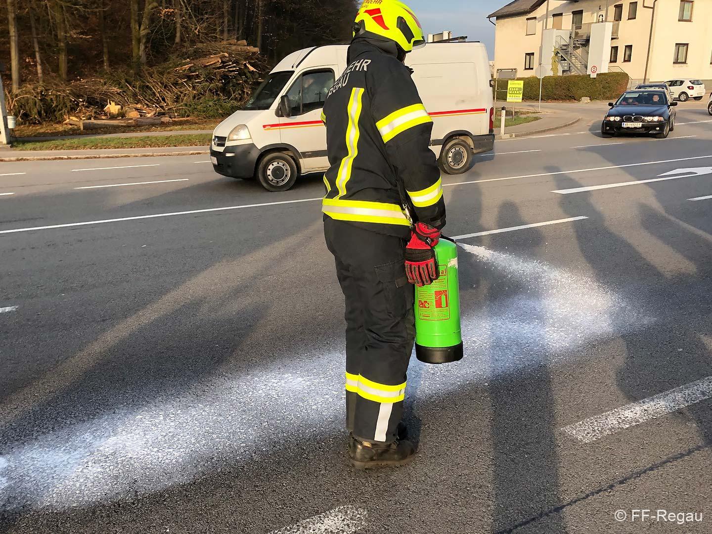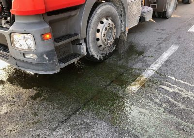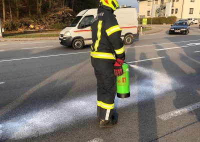 Wir haben die ausgeflossenen Flüssigkeiten mittels Bindemittel gebunden und anschließend noch Bioversal auf die Fahrbahn aufgetragen.