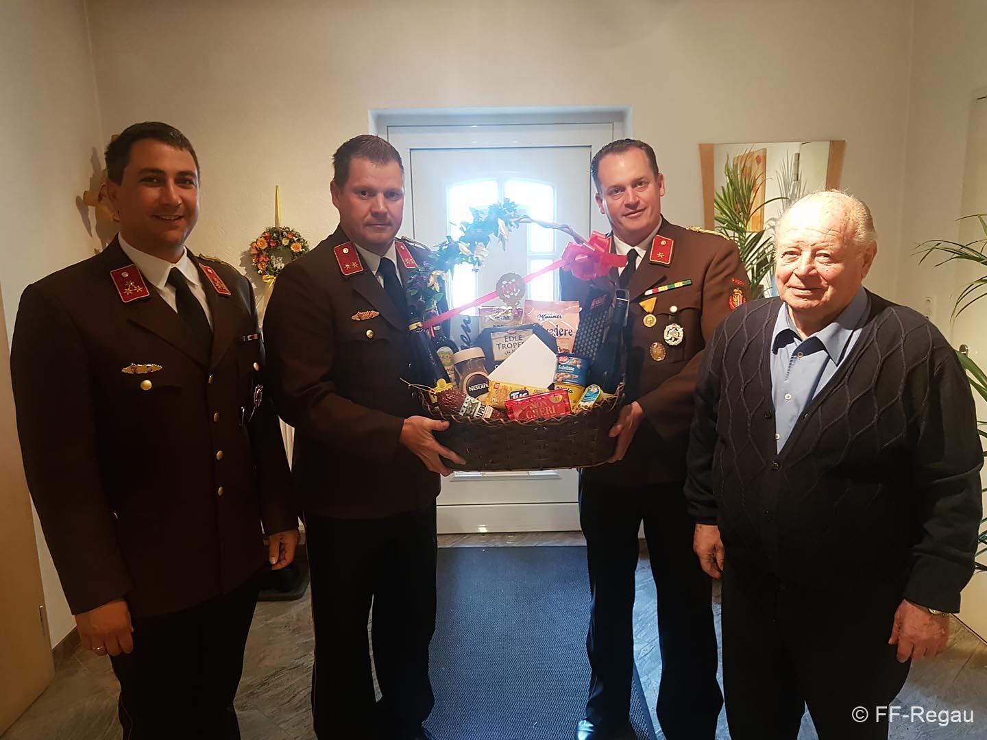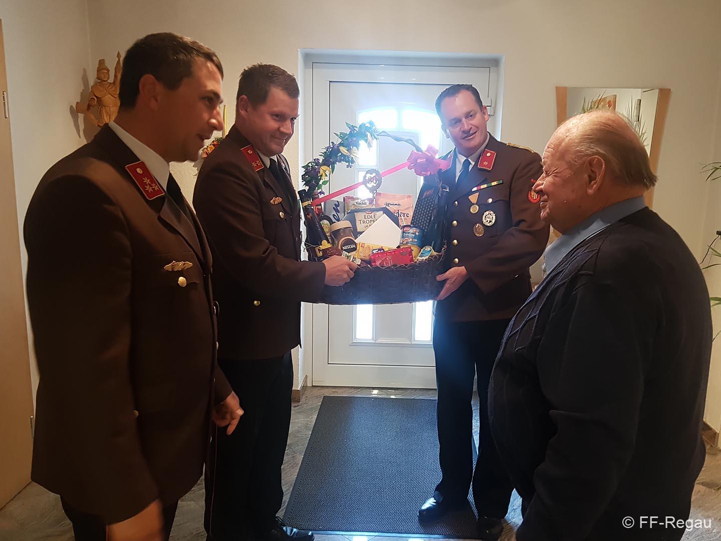 Als kleines Geschenk gab es einen Geschenkkorb für den Jubilar und Kommandant Staudinger dankte Karl für seine 59 Jahre im Dienst der FF Regau! Ebenso dankte er ihm für seine stete Mitarbeit im Feuerwehrwesen der FF Regau und vor allem auch für die Zurverfügungstellung seiner privaten Räumlichkeiten, wenn es Platznot im Feuerwehrhaus gab!