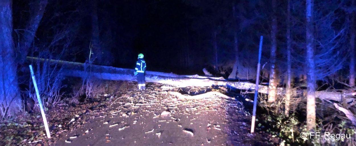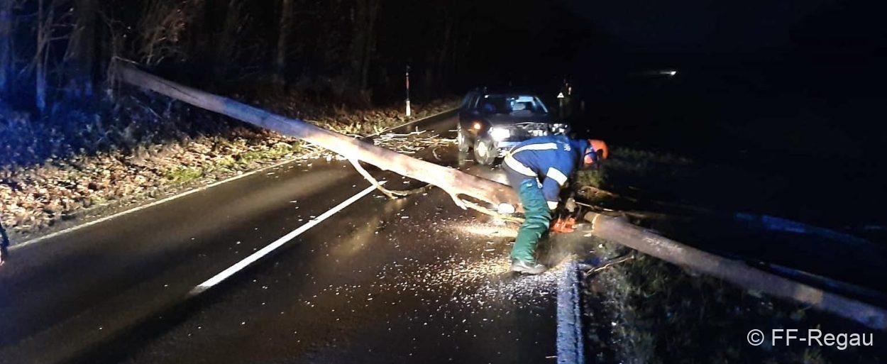 PKW prallte gegen umgestürzten Baum! "Baum über Strasse" lautete der Einsatz, der uns um 22.25 telefonisch von der Landeswarnzentrale erreichte....