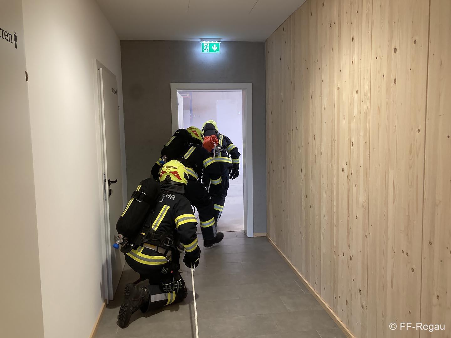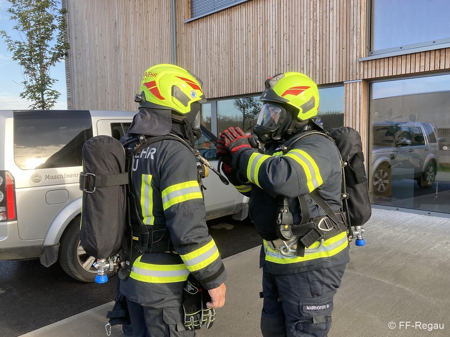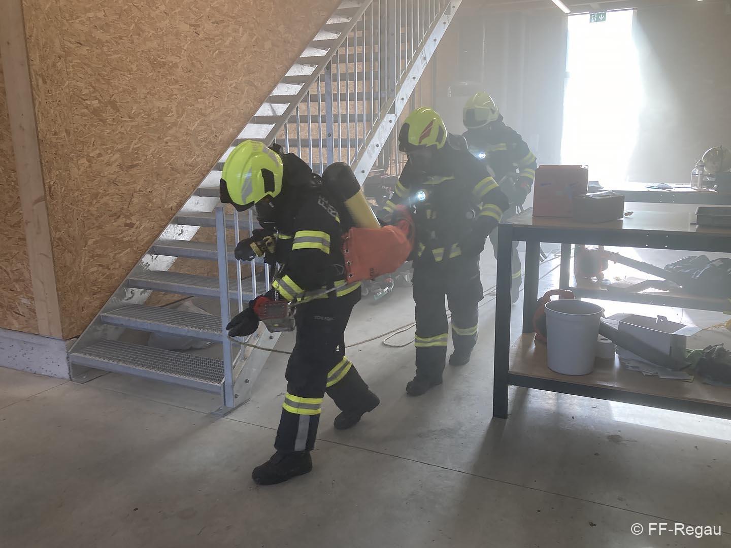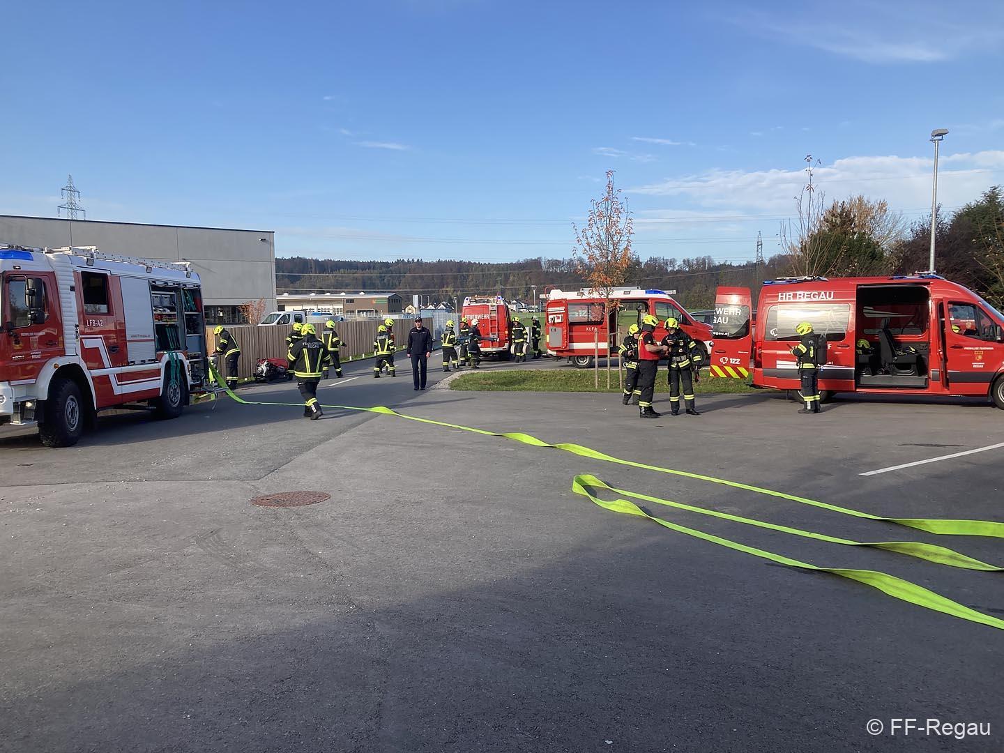 Übungsszenario war ein Brand im Chemiekalienlager im neu errichteten Gebäude vom Maschinenring. Weiters wurden Personen vermisst, der genaue Anzahl aber zunächst nicht bekannt war. Ein Atemschutztrupp der FF Regau nahm sofort die Erkundung auf und begab sich auf die Suche nach den vermissten Personen. Erschwerend dabei war der Zutritt zum Gebäude und die Unklarheit, wo sich die vermissten Personen aufhalten könnten.