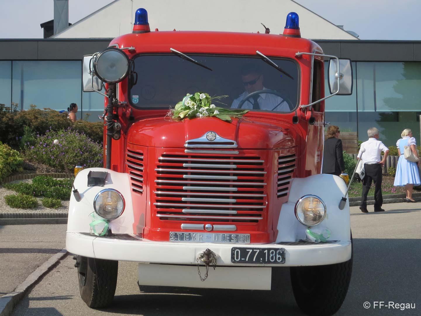 Die „schen Dirndln und Buam“ sowie das Brautpaar nahmen die Dienste unseres Oldies Steyr 380 als Brautfahrzeug in Anspruch und wurden von unserem Gerätewart Peter Mairhofer und Bordmechaniker Gerhard Stiedl sicher an ihre Ziele und schlussendlich zum Gasthaus gebracht. Dort gab es dann gleich wieder ein Ständchen der Musikkapelle.
