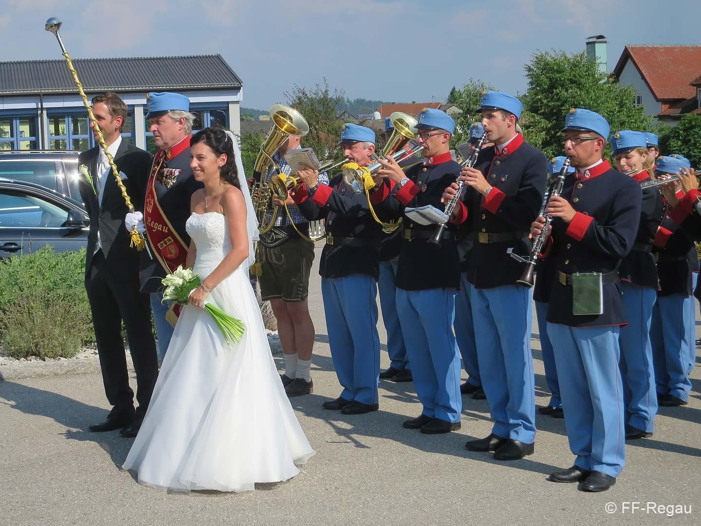 Am Samstag, den 8. August hat unser FW-Arzt Dr. Thomas Urich seine Lisa Weitzl geheiratet. Bei hochsommerlichen Wetter und Temperaturen standen wir in großer Anzahl vor und nach der Kirche für das Brautpaar Spalier und durften uns gleich nach hl. Messe als Gratulanten beim Brautpaar einstellen. Die kirchliche Trauung, welche von Pfarrer Kons. Rat Pfarrer Franz Hörtenhuber abgehalten wurde, wurde ganz besonders musikalisch von der Bürgerkorpskapelle Regau umrahmt, da die Braut schon lange aktives Mitglied der Musikkapelle ist.