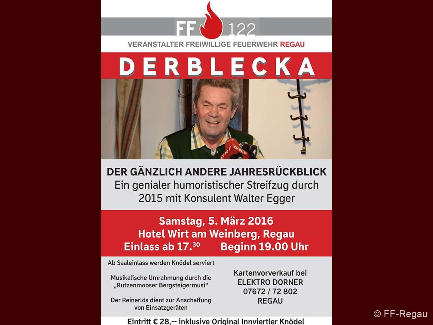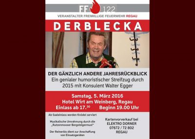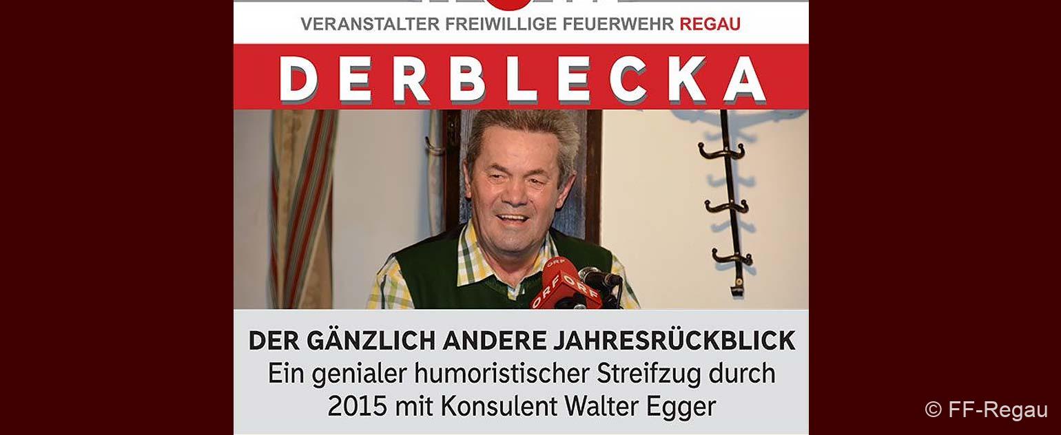 Die gute Nachricht für alle, die damals keine Zeit hatten oder die Walter Egger gerne wiedersehen und -hören möchten: Am 5. März kommt der Konsulent mit seinem genialen Jahresrückblick „Derblecka“ wieder nach Regau, und zwar ins Hotel Weinberg.